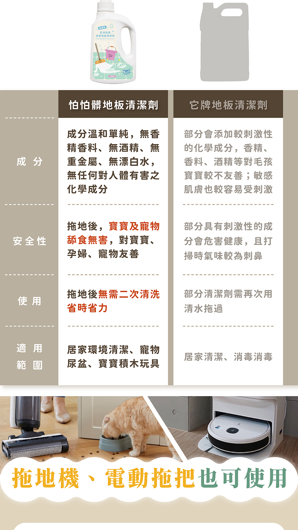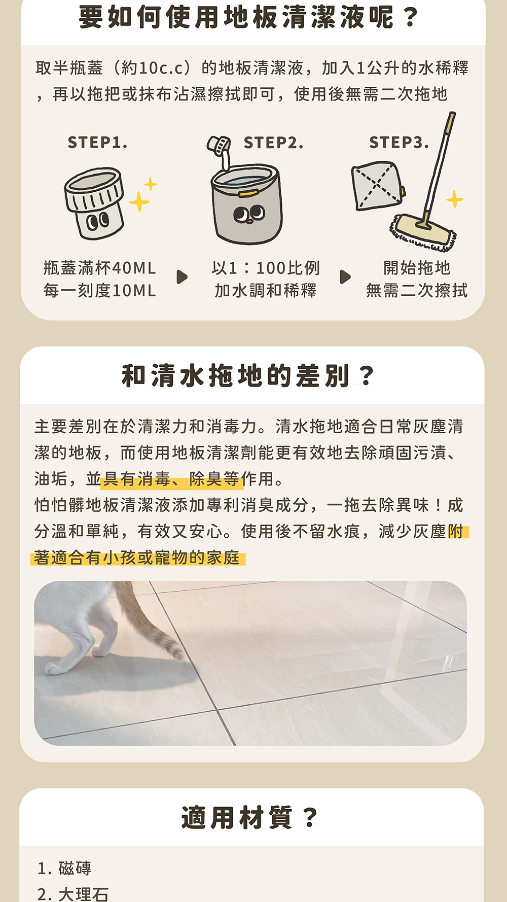 產品材質:磁磚、大理石、榻榻米、木質、塑膠、複合地板、兒童地板等皆適用【拖地後寶寶、寵物舔食無害】