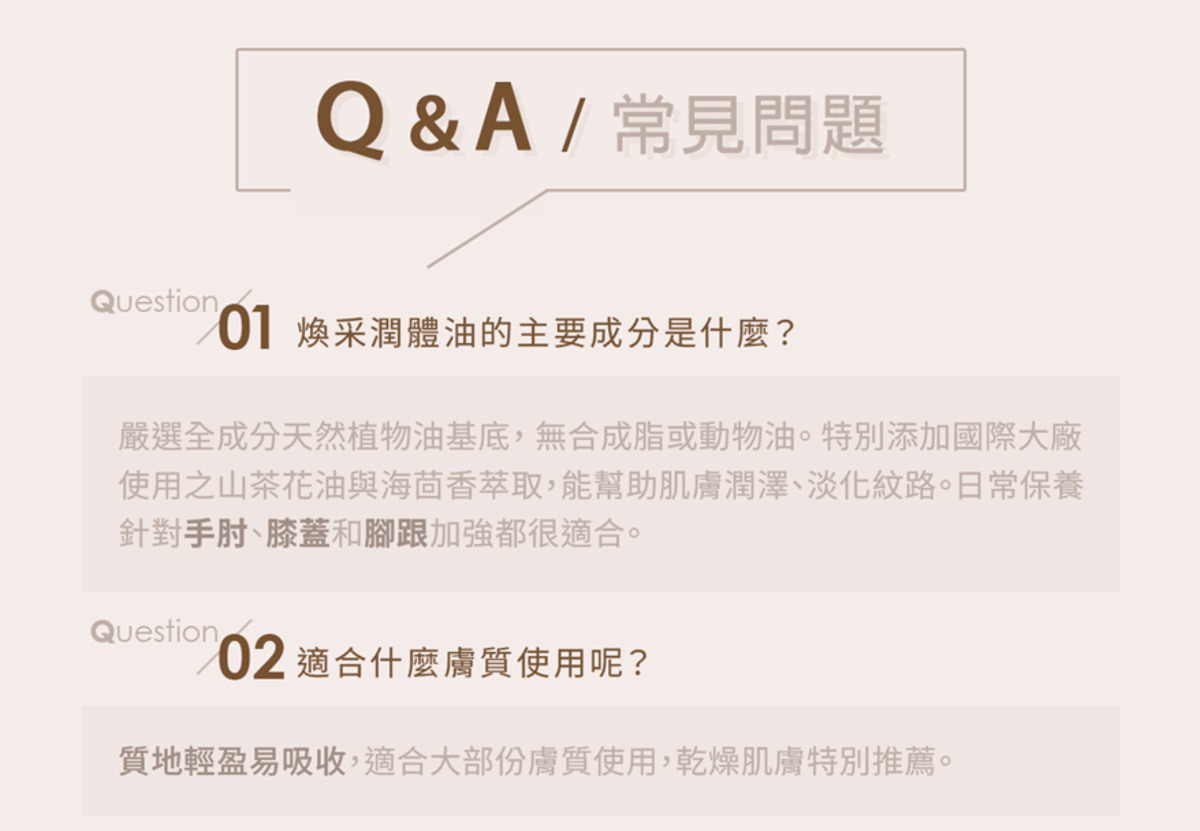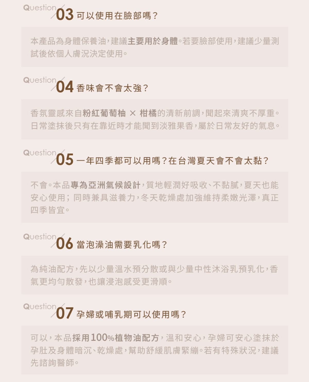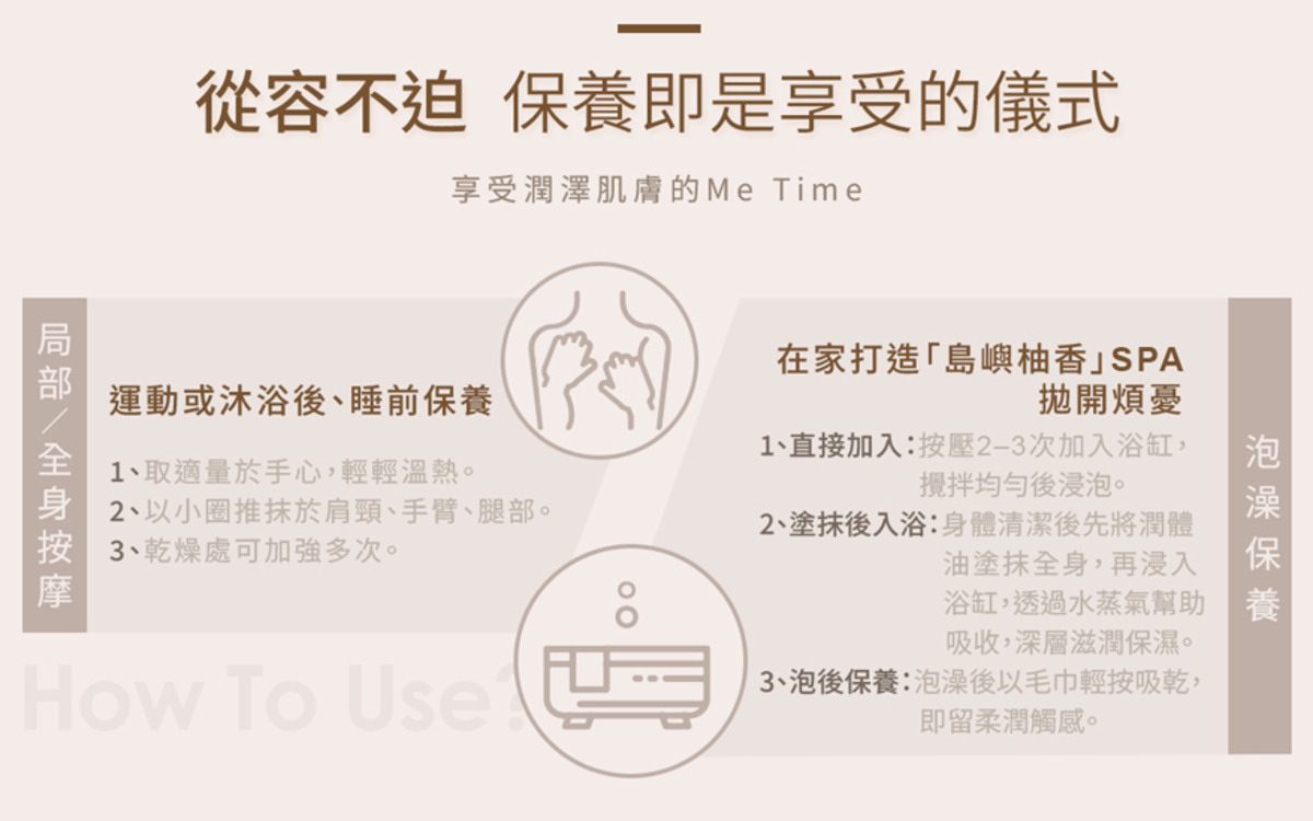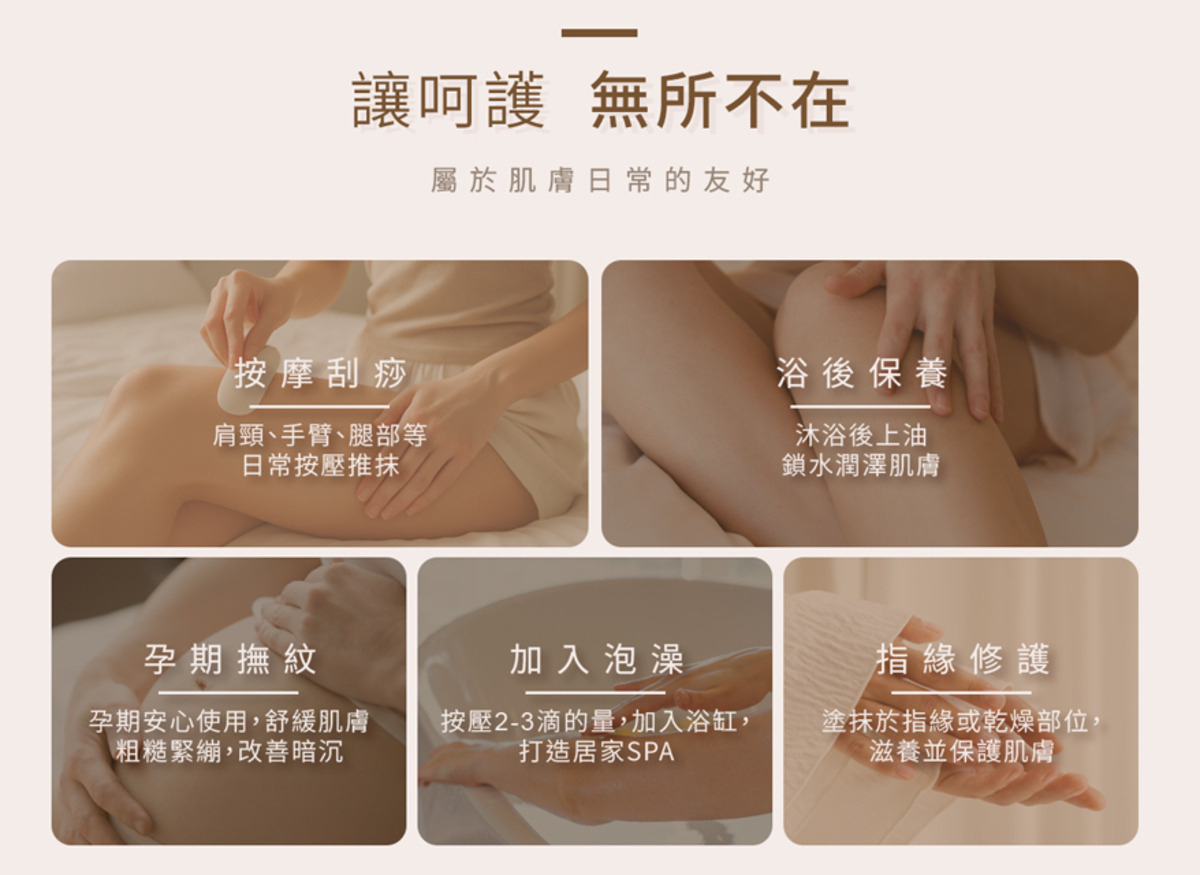 ▎ 適合身體乾燥處、泡澡、按摩與孕期撫紋使用