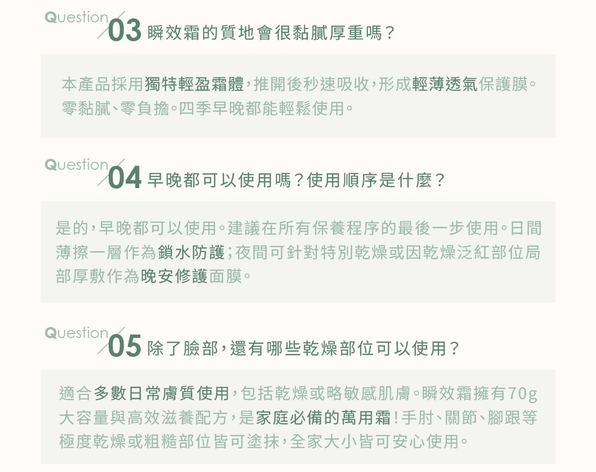 用途:適合乾燥、敏弱肌膚,於臉部及身體局部修護、舒緩及保濕使用。
